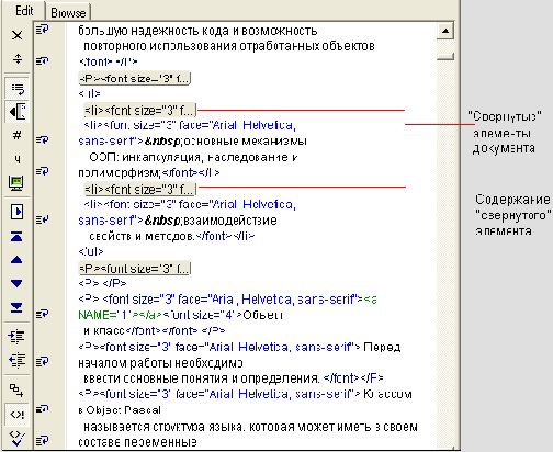 В HomeSite предусмотрены два способа свертывания фрагментов: